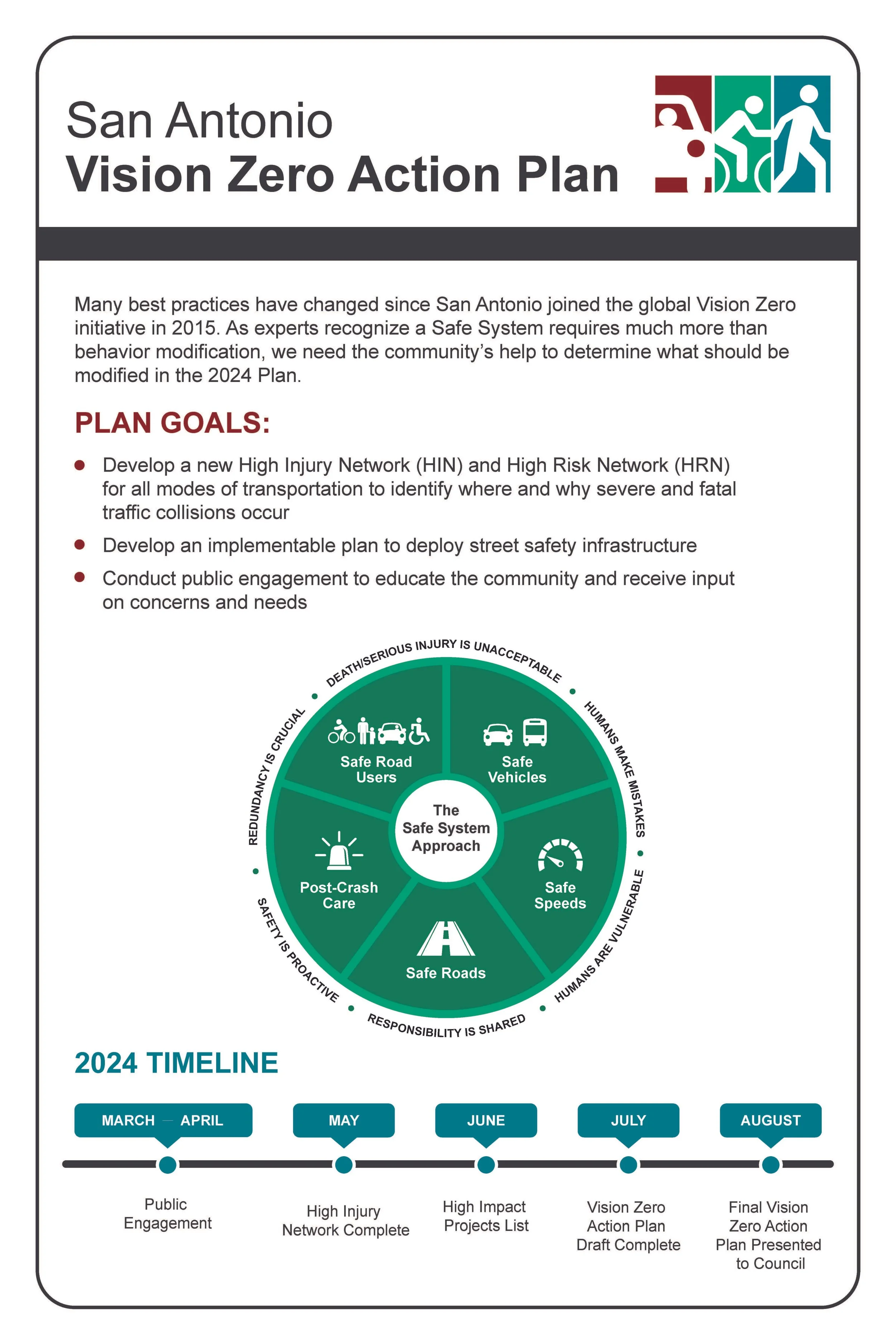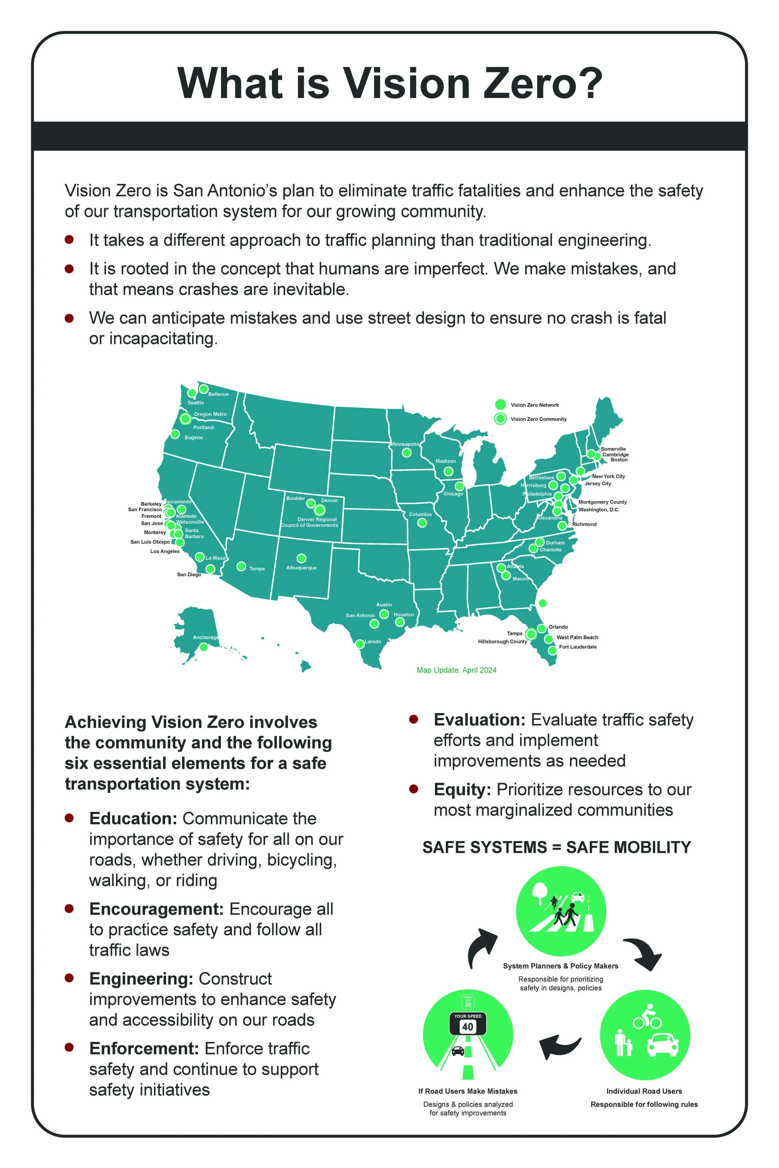 Overview: In 2024, the City of San Antonio updated its Vision Zero Action Plan (VZAP), a community-driven strategy to eliminate all traffic-related serious injuries and fatalities by 2040. The plan reflects the City’s commitment to safety, equity, and mobility for all road users. Since joining the global Vision Zero movement in 2015, San Antonio has implemented several key projects and continues to build on this progress. The 2024 VZAP update was officially adopted in the fall of 2024 and incorporated best practices and community feedback to identify new priorities and guide future transportation safety projects.