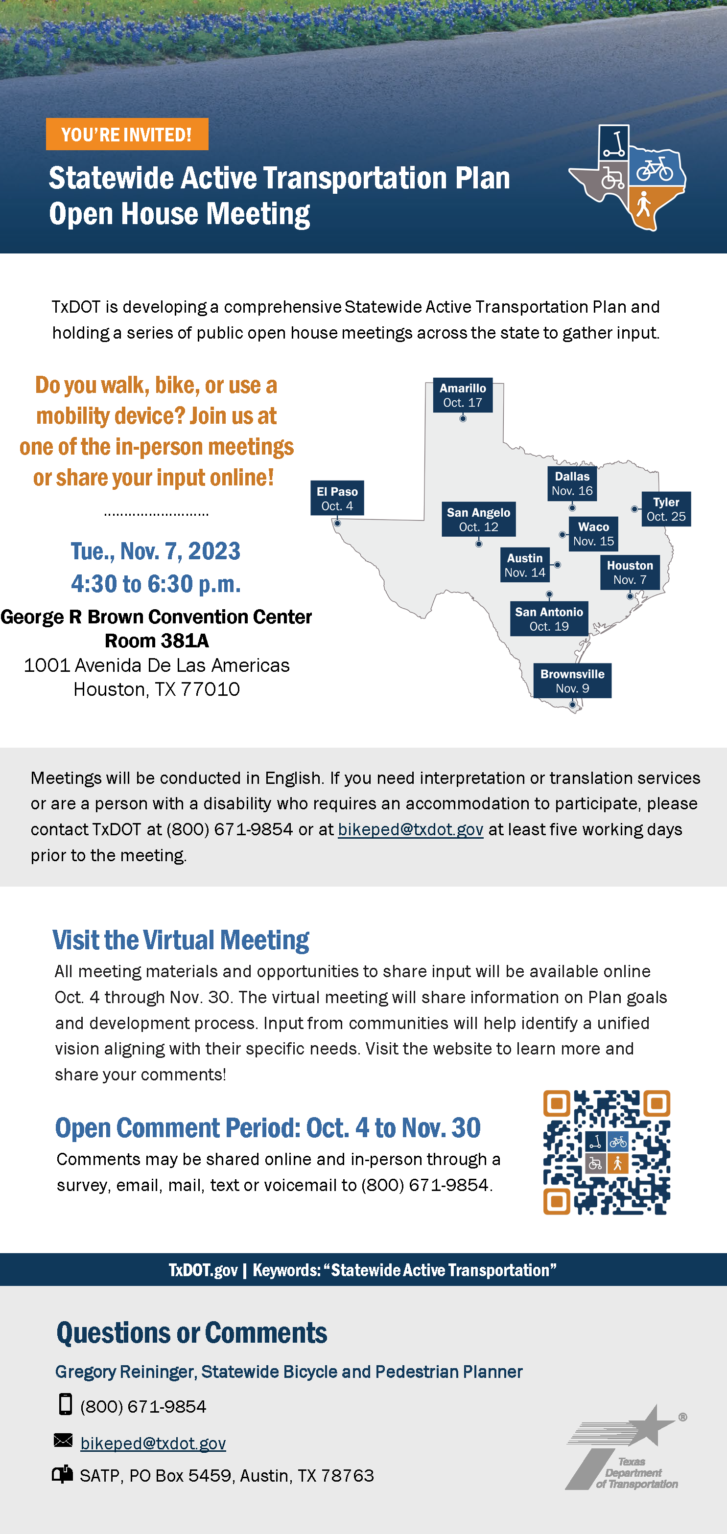 Overview: In 2023, TxDOT launched the first round of public outreach for its Statewide Active Transportation Plan to strengthen walking, biking, and rolling infrastructure across Texas. This early engagement phase focused on listening to community members across urban, suburban, and rural areas to identify key barriers, opportunities, and priorities related to active transportation. Insights gathered during this phase laid the foundation for a people-centered plan aimed at improving safety, accessibility, and statewide connectivity for all users.